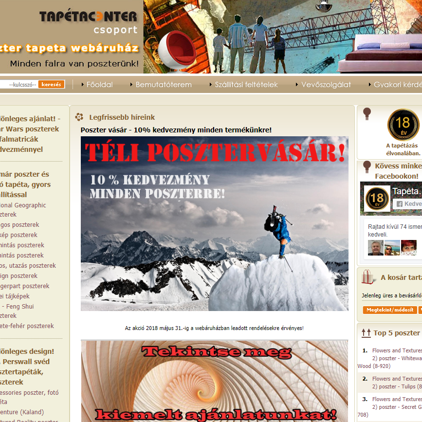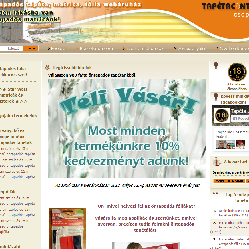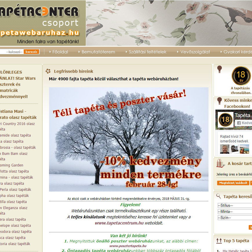 Tapétacenter üzletünk- 2005 november 7. óta áll a kedves vásárlók rendelkezésére széles tapéta- tapeta- foto tapéta, poszter, öntapadós tapéta, öntapadós fólia választékával. Üzletünkben 450 féle tapéta, 1200 féle bordűr és szegély, 400 féle öntapadós tapéta található. A tapéták között van habosított tapéta, selyem tapéta, papír tapéta, vlies tapéta, üvegszövet tapéta. A helyszínen található tapétákon kívül, még 28.000 féle tapéta választható katalógusból. Katalógusból való választás esetén, 10-30 napon belül szállítunk a megrendelőink részére, figyelemmel a különböző gyárak szállítási rendjének megfelelően. Gyorspostával történő megrendelés esetén 5 munkanapos szállítási határidőt vállalunk, térítési díj ellenében. Az import tapétákat, 50%-os előleg megfizetése mellett lehet megrendelni.